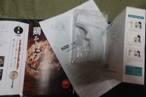 ただ今の食卓の上 中国からの体温計と、カロリーを減らす献立のムック! この体温計、非接触の1秒高速測定ということで、まぁ、問題なく使えますが、届いたとき箱が開いていて、本体のほかに、電池が入っていたとおぼしき穴の跡がありましたが、中身は無し。…